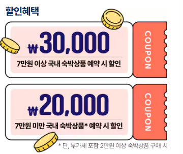 아래 링크를 통해 7만원 이상 국내 숙박 상품 예약 시 30,000원 / 7만원 미만은 20,000원의 할인권을 받으실 수 있습니다.